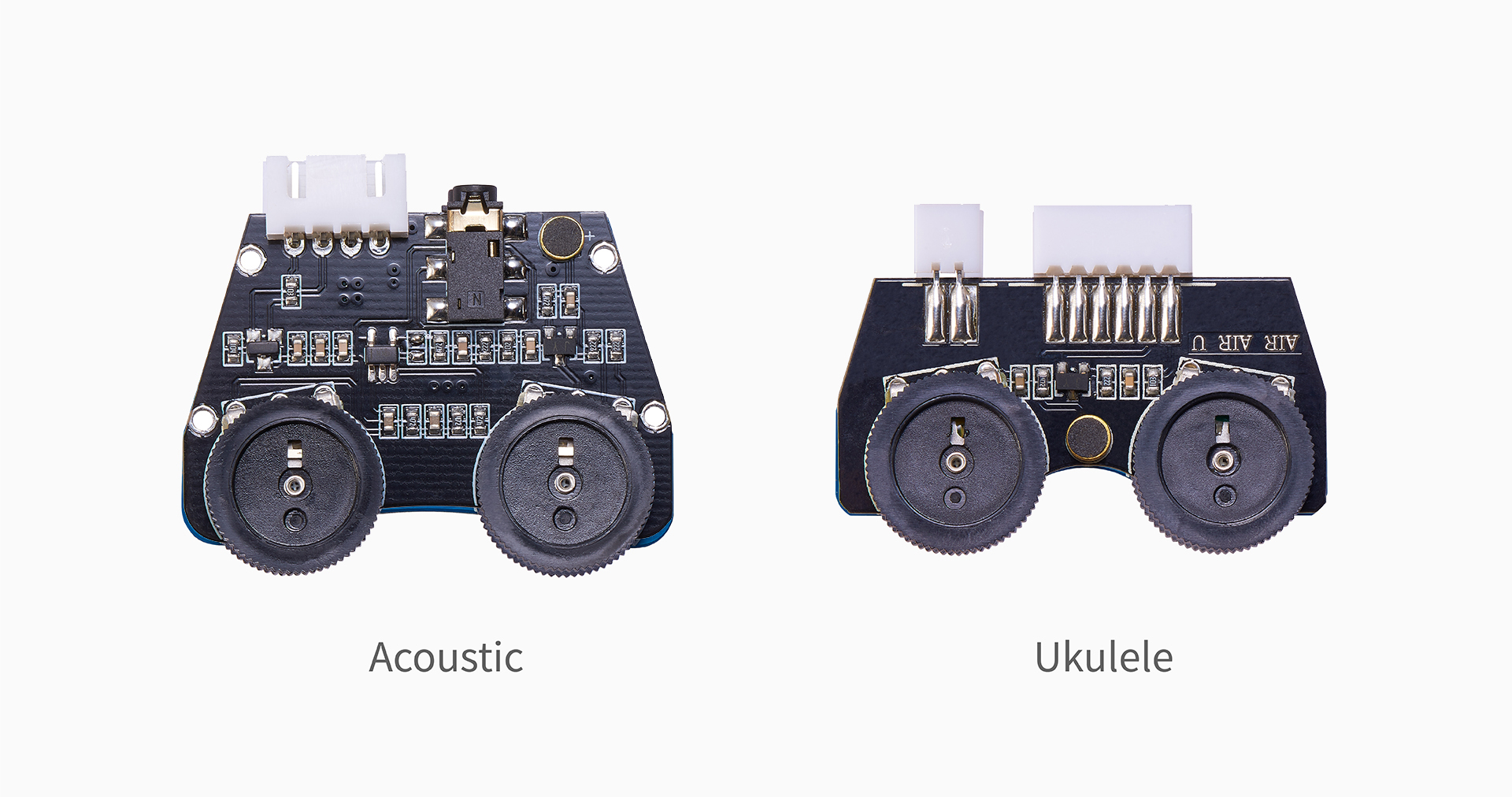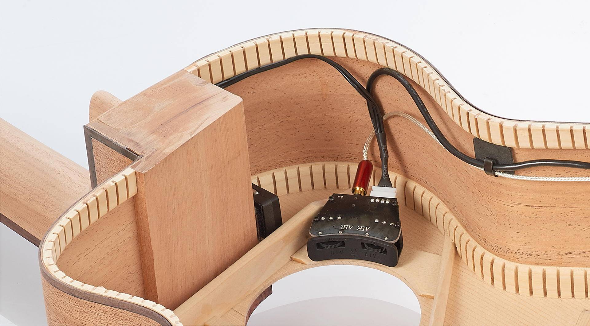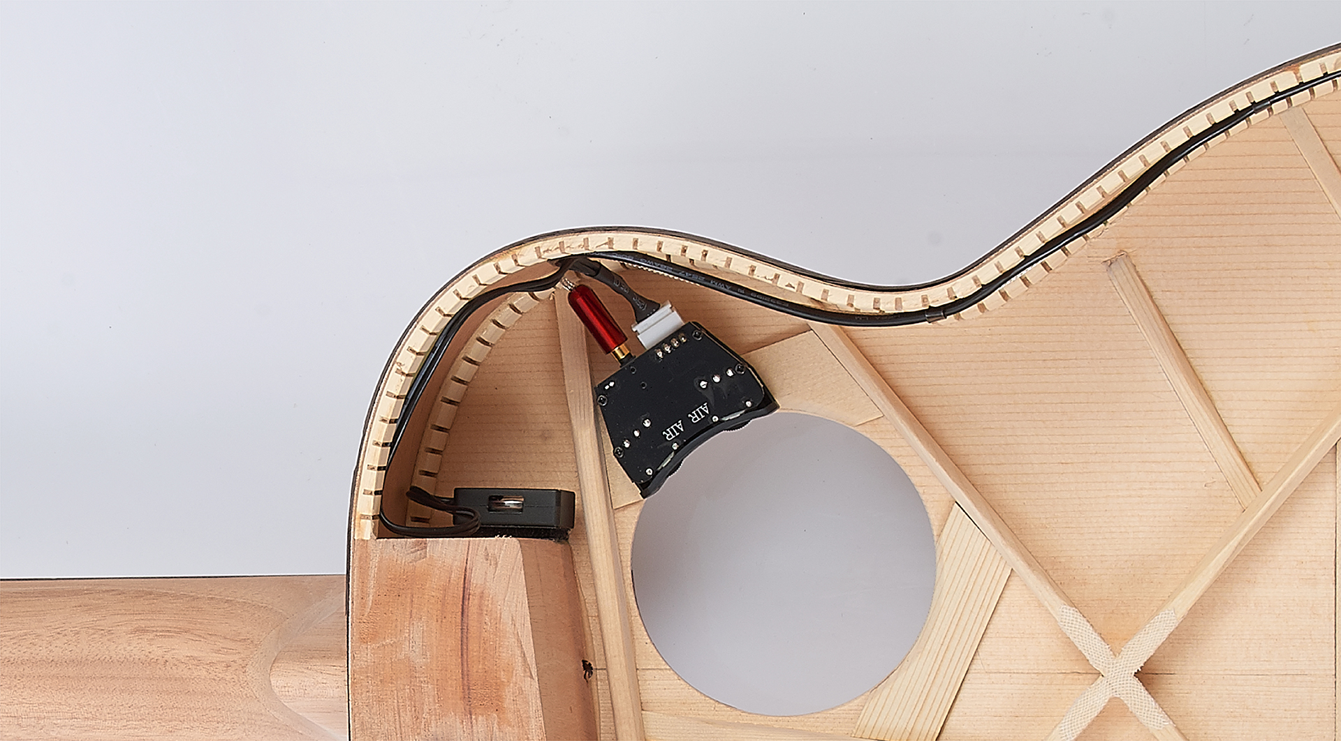 On the Control unit, a high performance Omni-Directional Air Microphone is sitting on the PCB Board. The "purest" microphones in terms of low coloration; they add very little to the original sound. Being pressure-sensitive they can also have a very flat low-frequency response down to 20 Hz or below. The Air Mic adds harmonically rich tone, and pick up the air reflex. Mic level can be adjusted to the fingerstyle percussion on the instrument body.