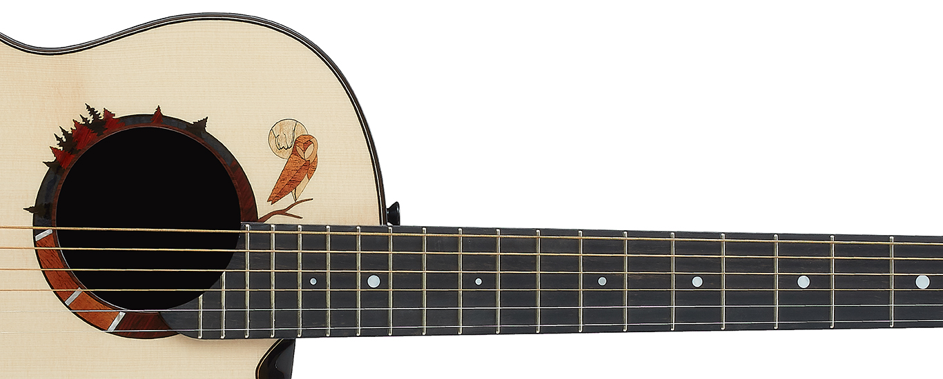 The geometric design around the soundhole features Alan's favorite owl motif, intricately inlaid with eight carefully selected types of wood, depicting a forest scene with owls under the moonlight. The embellishment of white mother-of-pearl resembles moonlight gently cascading through the woods, creating an intriguing allure during fingerstyle play.