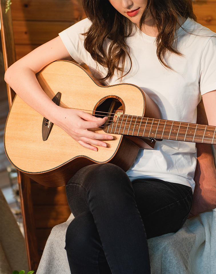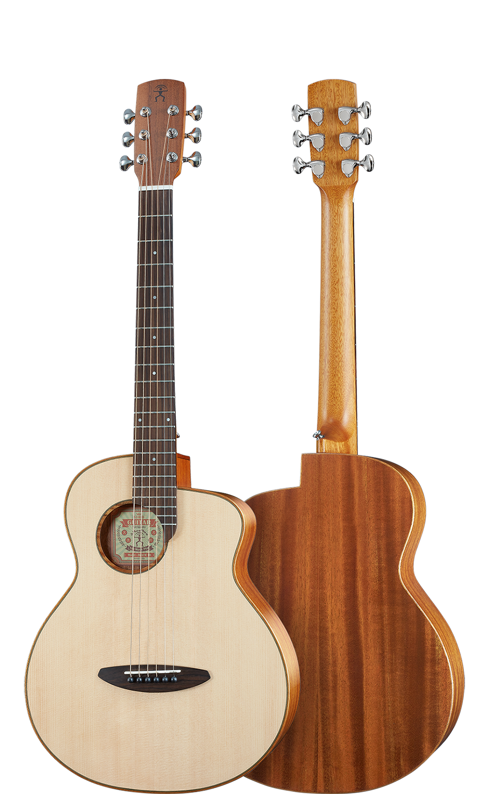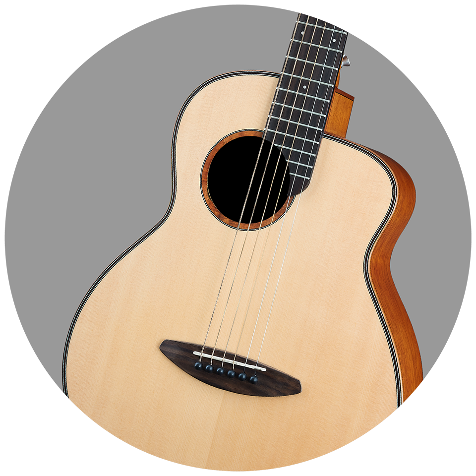 M10 & L10 used Spruce as a top, and Mahogany as a back and side wood. It delivers a fast tonal transfer, a bright and organic tone and the bass is on the warmer side. Seasoned tops are stable, but does take time to open up and deliver a more beautiful transcendent overall tone. A solid top in comparison will possess a more complex timbre than a laminated top.