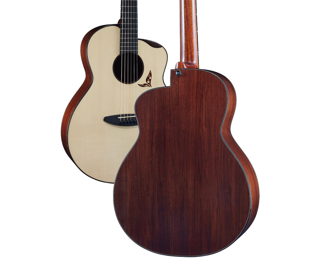 Featuring a moon spruce top paired with Madagascar rosewood back and sides, this guitar delivers an unparalleled sound experience. The Madagascar rosewood, with its rich red-brown hues and spider-web grain, combines deep bass, rich highs, and robust mids, rivaling the finest Brazilian rosewood.