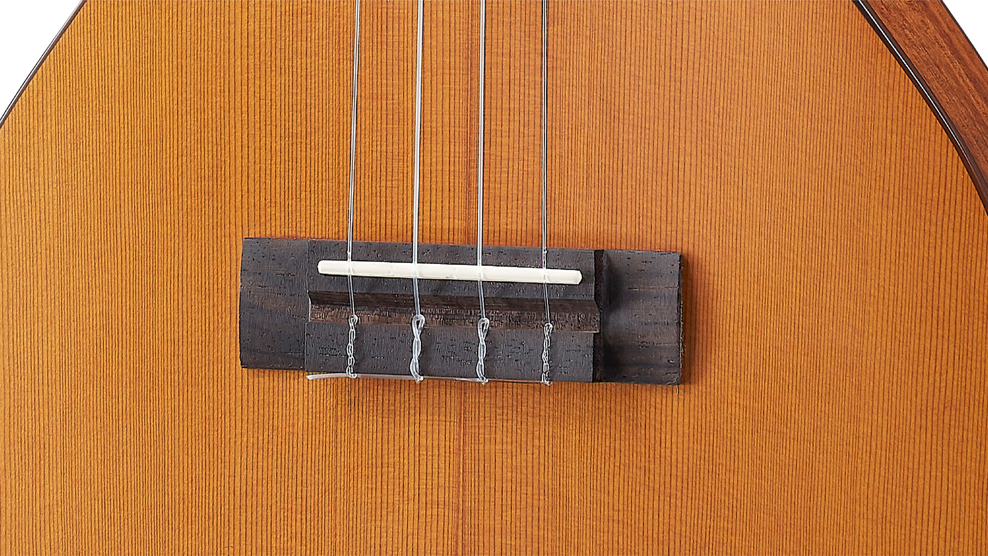 The rectangular rosewood bridge helps support the string tension. The Synthetic Bone for the nut which is very hard and articulate. This helps the strings to vibrate and to have a deep resonance.