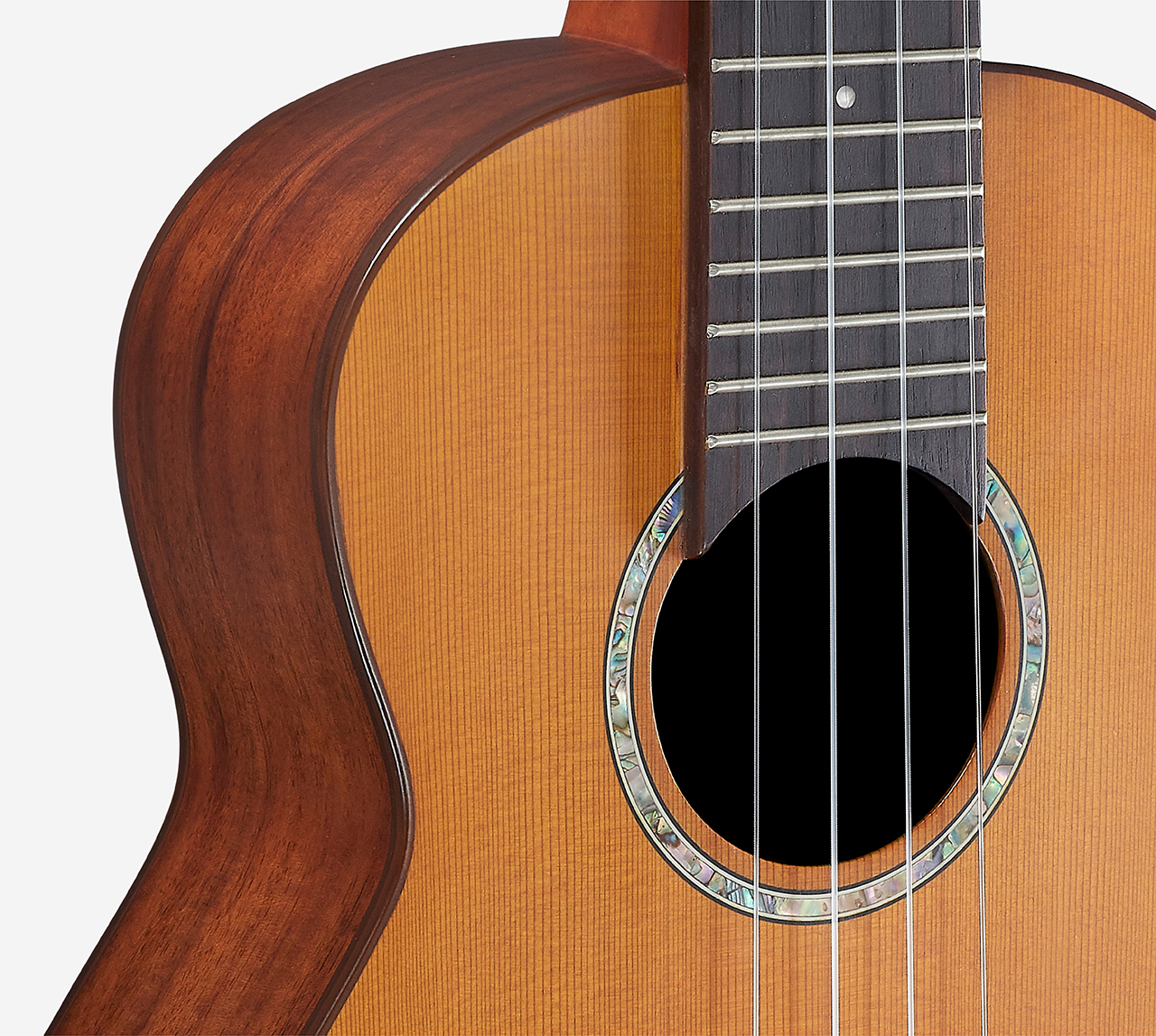 In comparison cedar is darker looking and softer than that of spruce, which allows for a softer touch that will produce wonderful harmonic tones and sustained resonance. This tonewood bestows a sweet, warm, and beautiful sound with light touch and makes it ideal for those interested in fingerstyle playing.