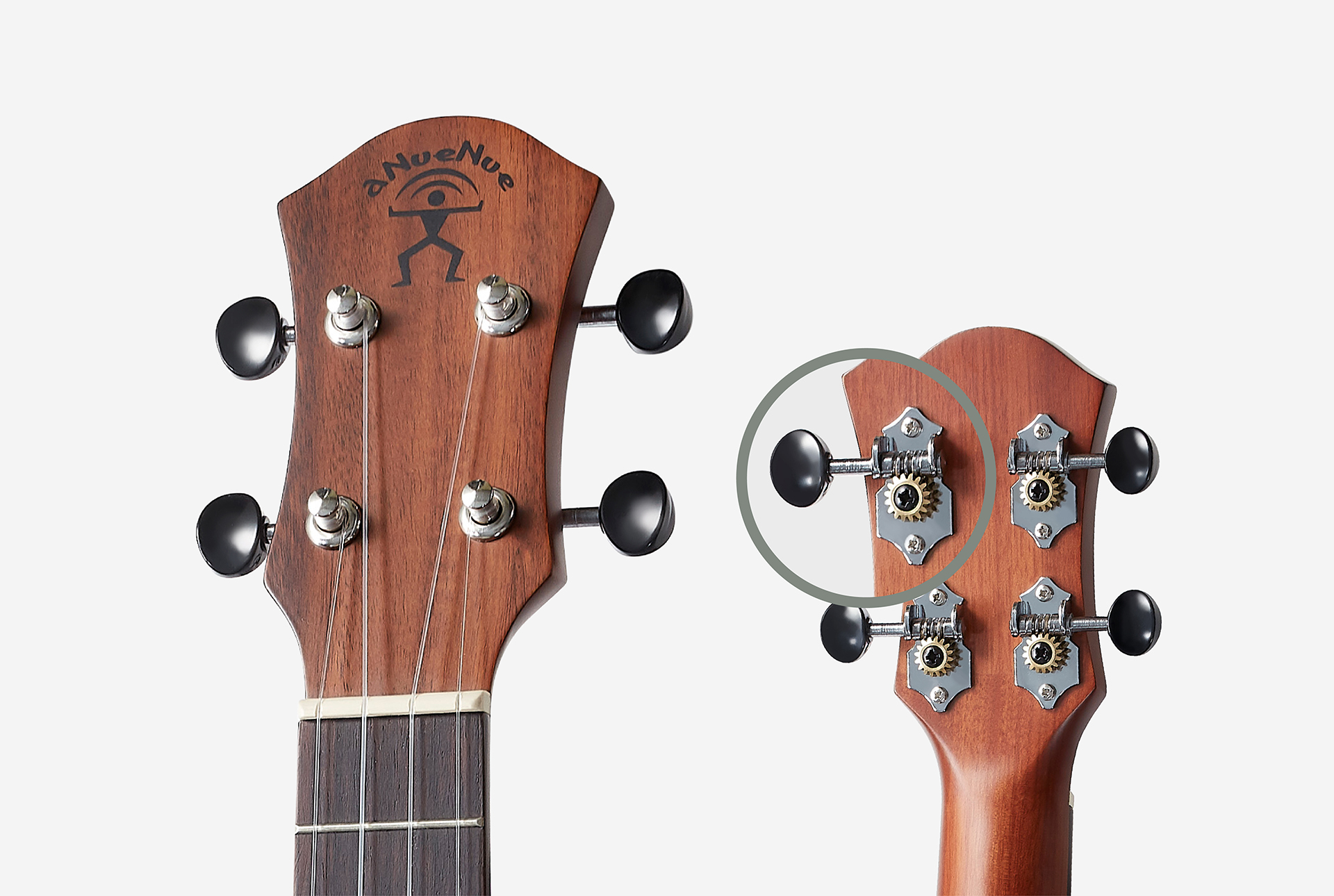 aNueNue classic-headstock design made with a Acacia koa veneer with aNueNue decal logo. The tuners with 1:16 gear ratio for precise tuning.