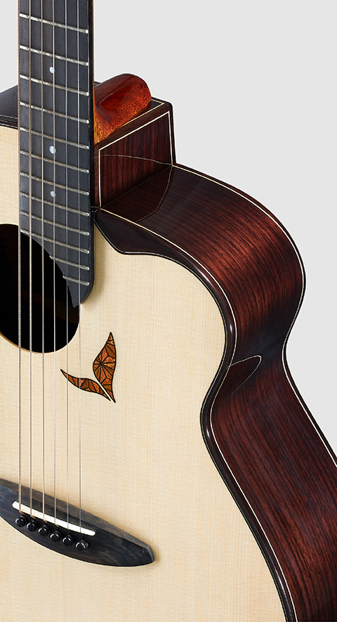 切角倒角設計,讓高把位更好上手。箱根寄木細工拼花飛鳥設計在飛翔在音孔旁,與補償音孔設計相對稱,增添層次與細節。