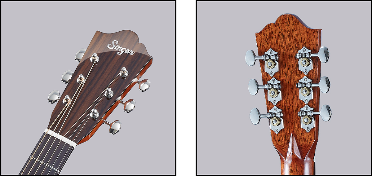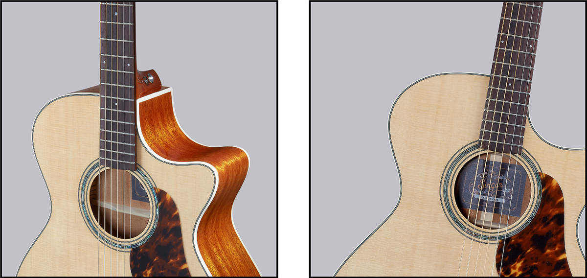 吉他的設計細節奢華而不浮誇,琴身的象牙白鑲邊,以及貝殼鑲嵌的琴頭 logo 和音孔花圈,皆展現對傳統的致敬。高光漆面提升耐用性,並增添精緻感,成為日常演奏與創作的理想夥伴。
