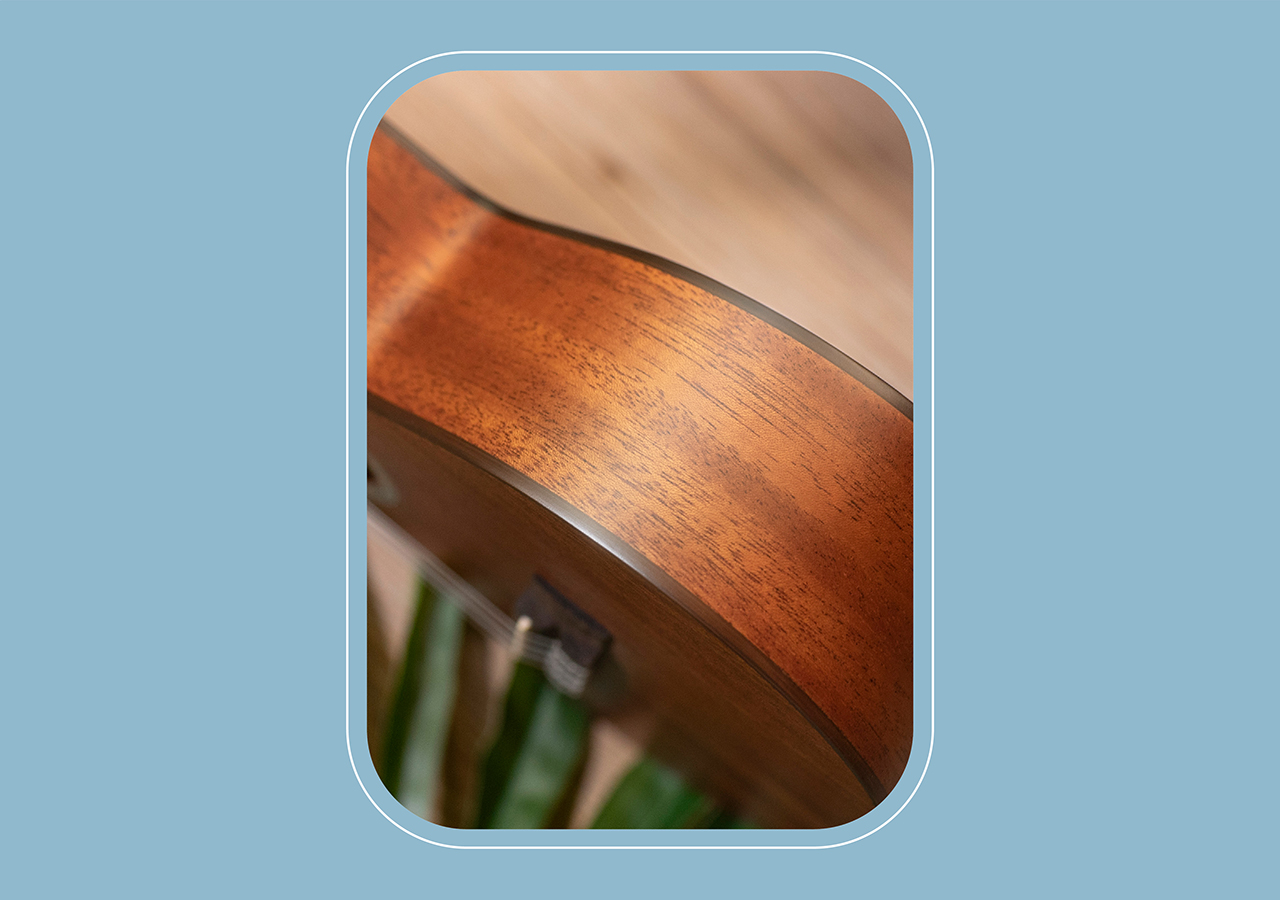桃花心木,紋路較直,質地堅硬重量輕,聲音傳導較快,音色清脆高亮。彈奏時高頻較有顆粒感,低頻的呈現較溫暖豐富。 合板木材音色穩定,堅硬不易彎曲變形的特性,較不受氣候與濕度變化影響,能適應劣質的環境。中層使用白楊木,維持木頭之間良好的傳導之外,能有效減輕重量。