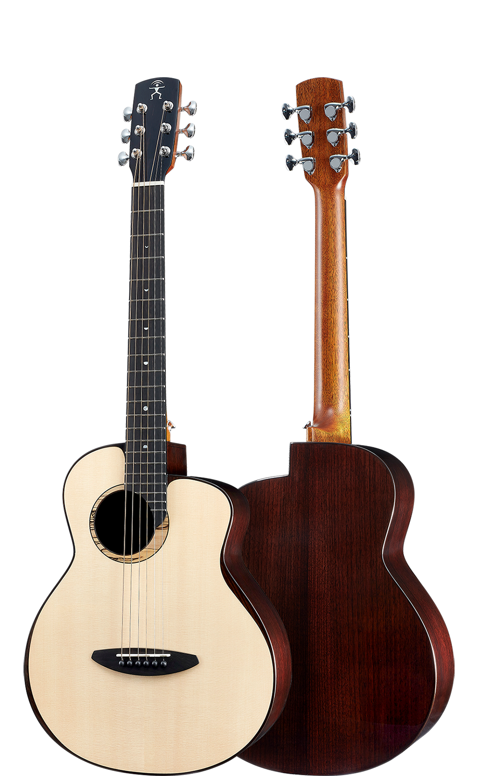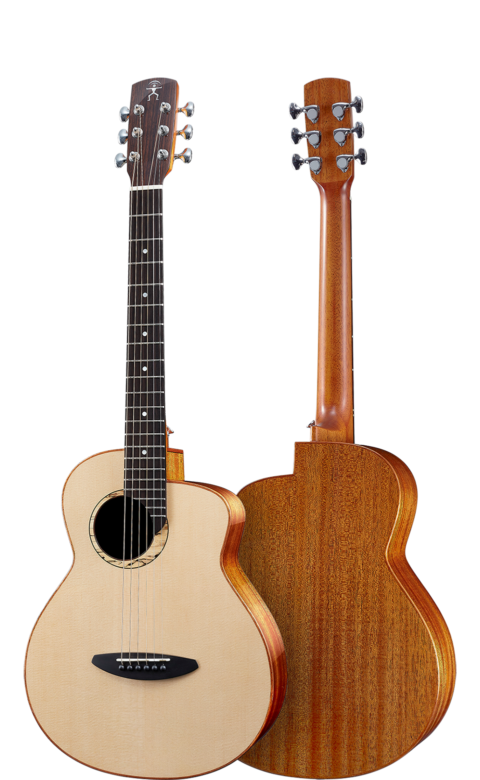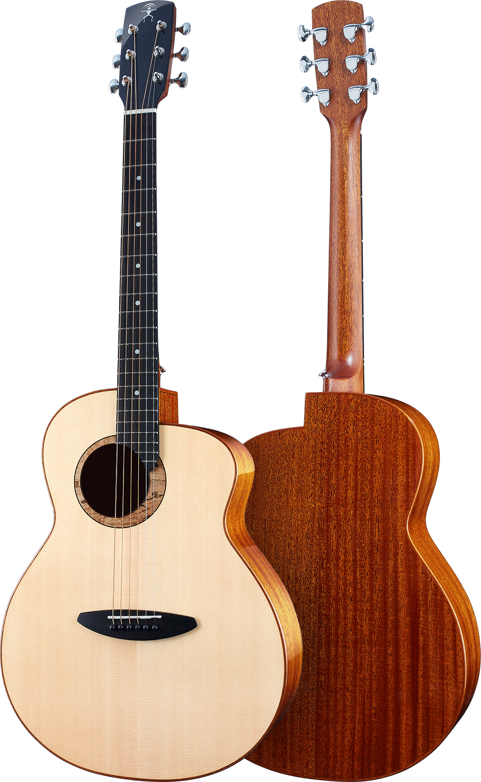 西特卡雲杉質量輕盈,非洲桃花心木穩定性優異,兩者聲音傳導皆快的特性,在低音、中音及高音的平衡上均有相當不錯的表現,適合各種彈唱與演奏。
