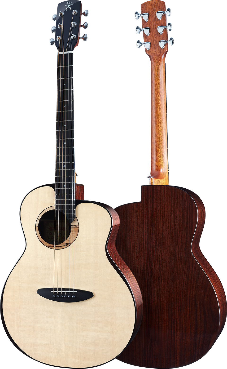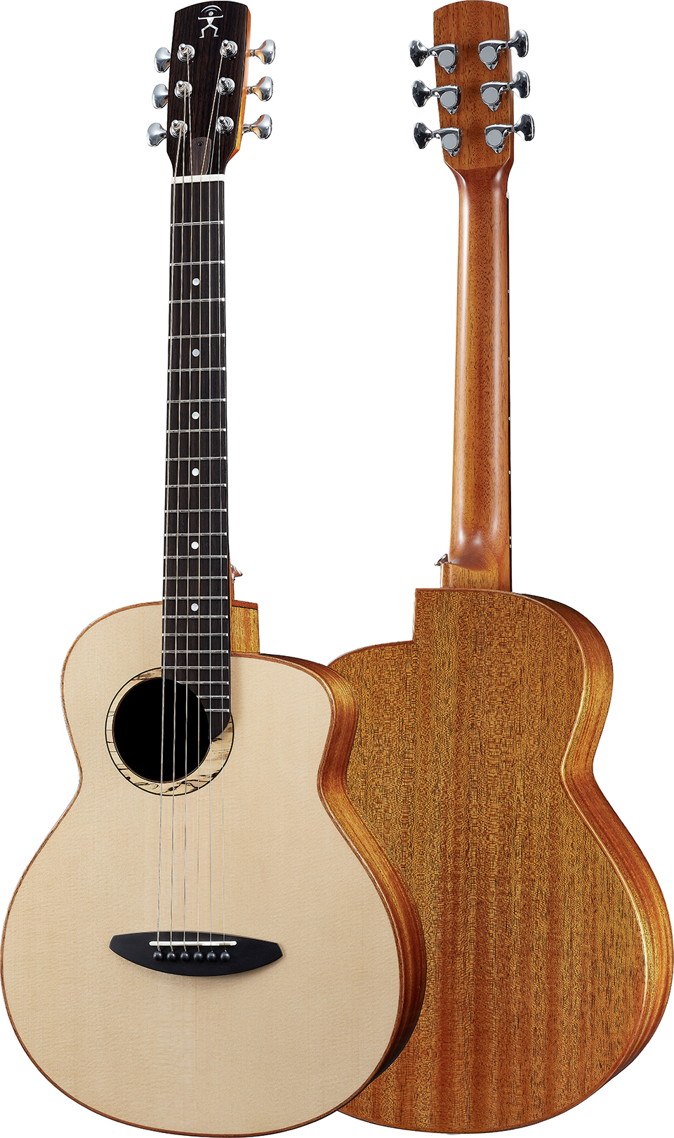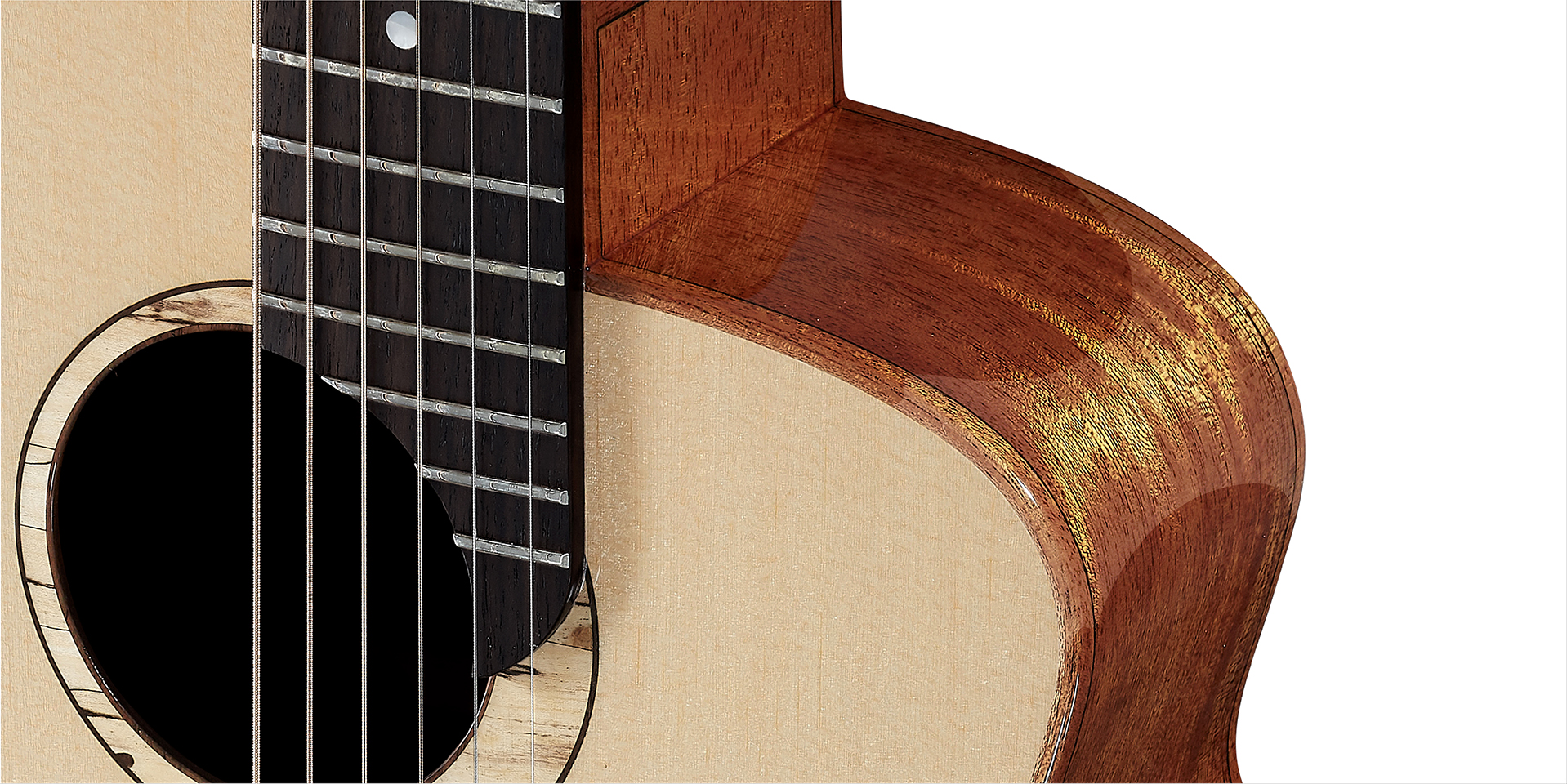 西特卡雲杉質量輕盈,非洲桃花心木穩定性優異,兩者聲音傳導皆快的特性,在低音、中音及高音的平衡上均有相當不錯的表現,適合各種彈唱與演奏。