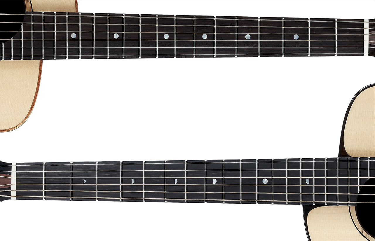 指板使用硬度較高的玫瑰木,氣孔較多、含有豐富油脂的特性,讓玫瑰木指板能適應各種環境,能有效傳導聲音震動。琴頸與指板經過拋光、打磨、倒角、去毛刺等多種細節程序處理,讓持琴手感更加舒適。上弦枕寬度為44mm,擁有21格琴格讓彈奏音域更廣。