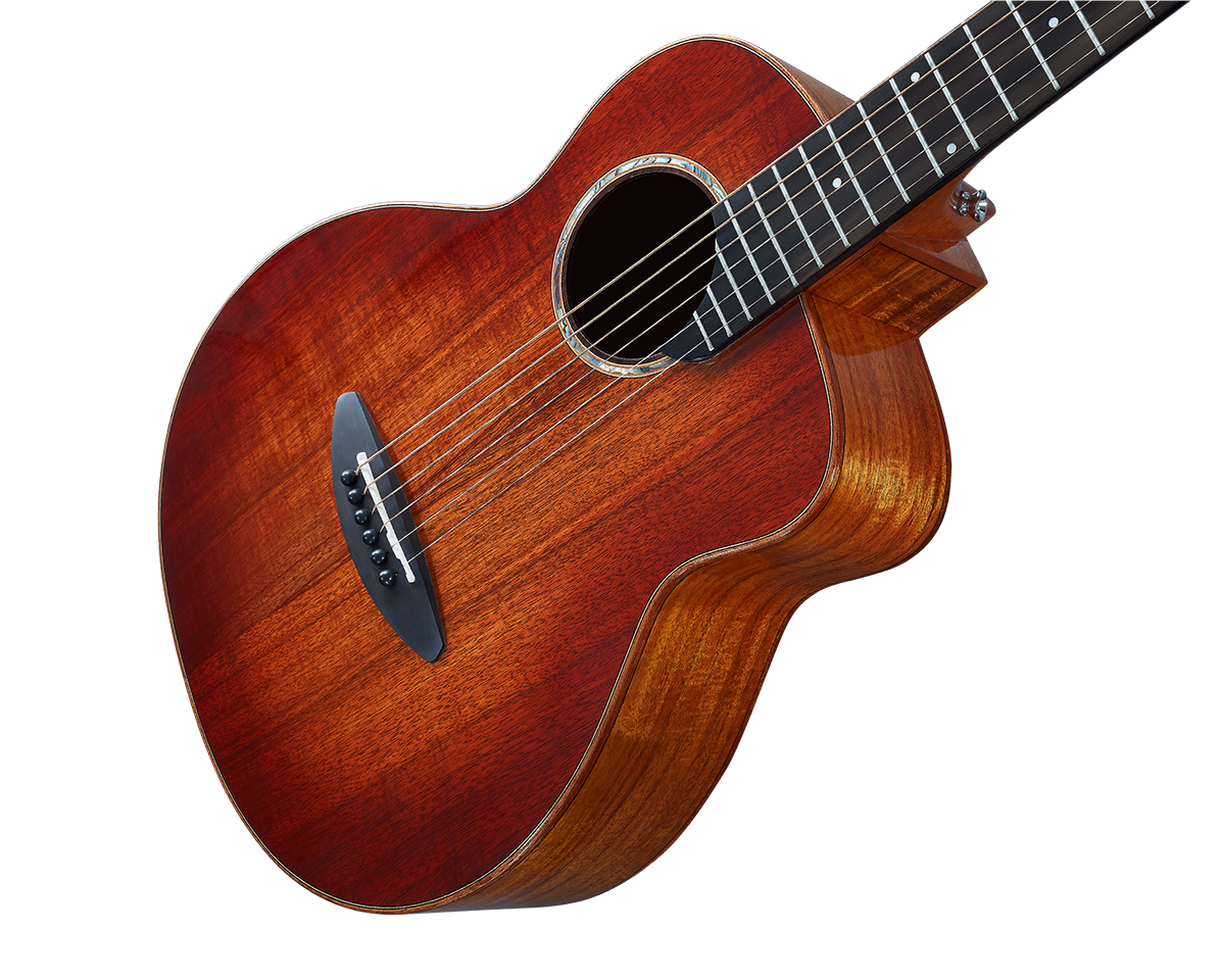 杉田健司為吉他未來系列「一體共振」空氣的波動,撥弦後釋放出來的波動,首先面板達到共振,可以和周邊琴身,琴柄,琴頭一層一層達到共振,而帶動出美妙的音色。光透面板厚度控制在2.5mm,力木設計要能夠穩定面板,防止變型和支撐弦的張力。經過三年來反覆的調校,做出清晰有彈性的音色,消除木頭硬硬的音色。