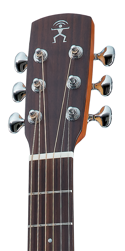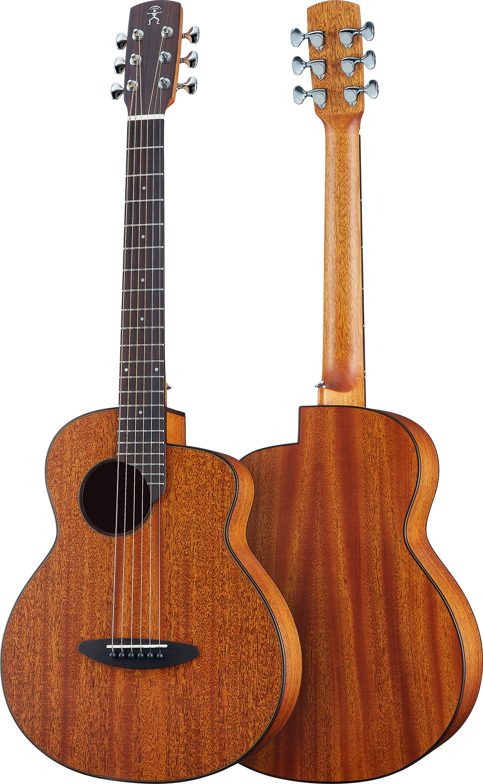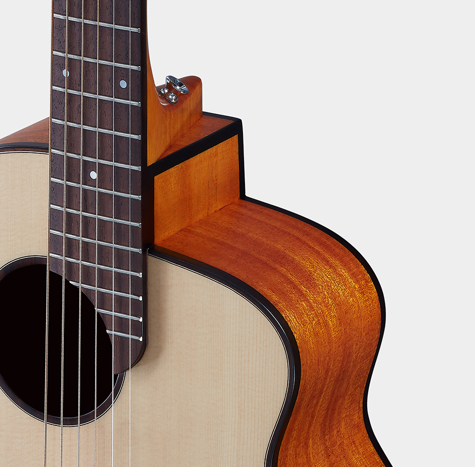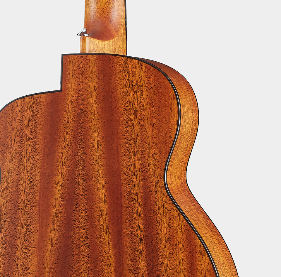 面板選用桃花心木的升級版M25,音色清脆高亮;自然優雅的琴頭則以玫瑰木打造,啞光漆的吉他表面顯得柔和宜人,白貝指板點的搭配增添了視覺風采。