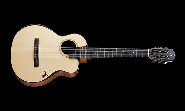 指板點以白貝殼鑲嵌驢子腳印,並在面板上有著以玫瑰木鑲嵌的驢子圖案。靠近琴身邊緣的圖案設計,搭配彈琴時琴身擺放的角度,讓驢子的圖案像沿著陰晴圓缺的鑲邊設計上雀躍走路的感覺,相當可愛。