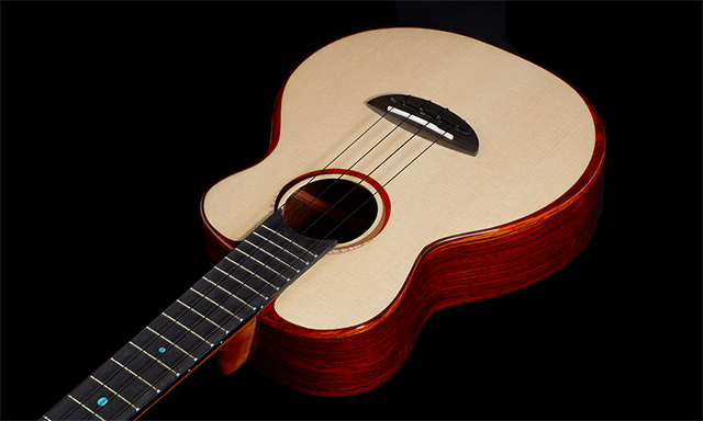 與 Tobias 合作的第二把客製琴,原型琴為UT200。設計上將原本的印度玫瑰木背側板改為可可波羅木,藍色綠松石鑲嵌的大小點指板點。花圈延續前一把客製琴的設計,簡單的線條以虎紋楓木、相思木、玫瑰木與可可波羅木做鑲嵌,鮮紅的可可波羅木襯托也協調了奶油黃的月亮雲杉。