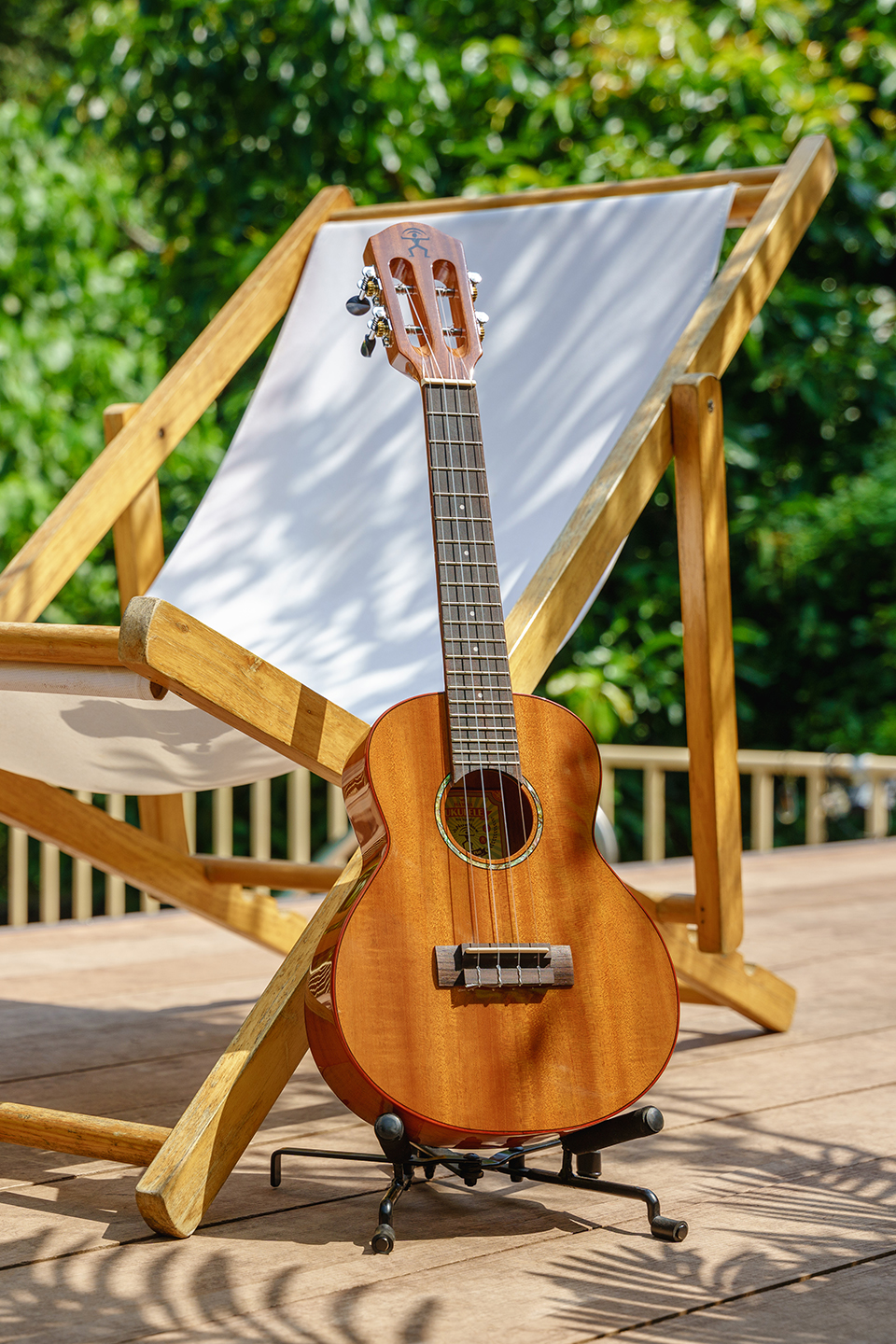全單板的木材,讓琴的震動和諧,充分發揮木材自然特性的音色,擁有完整的共鳴。也由於台灣桃花心木其獨特的生長環境,常常會帶來一些天然的紋理變化。經過精心挑選與處理的每一塊木頭,經過數年的自然乾燥所製成,保留了自然紋理與色澤,也讓每一把琴都是獨一無二的存在。這樣的木質結構,不僅提供出色的共鳴表現,也讓這把烏克麗麗不需要華麗的包裝,就能在視覺與音色上脫穎而出。