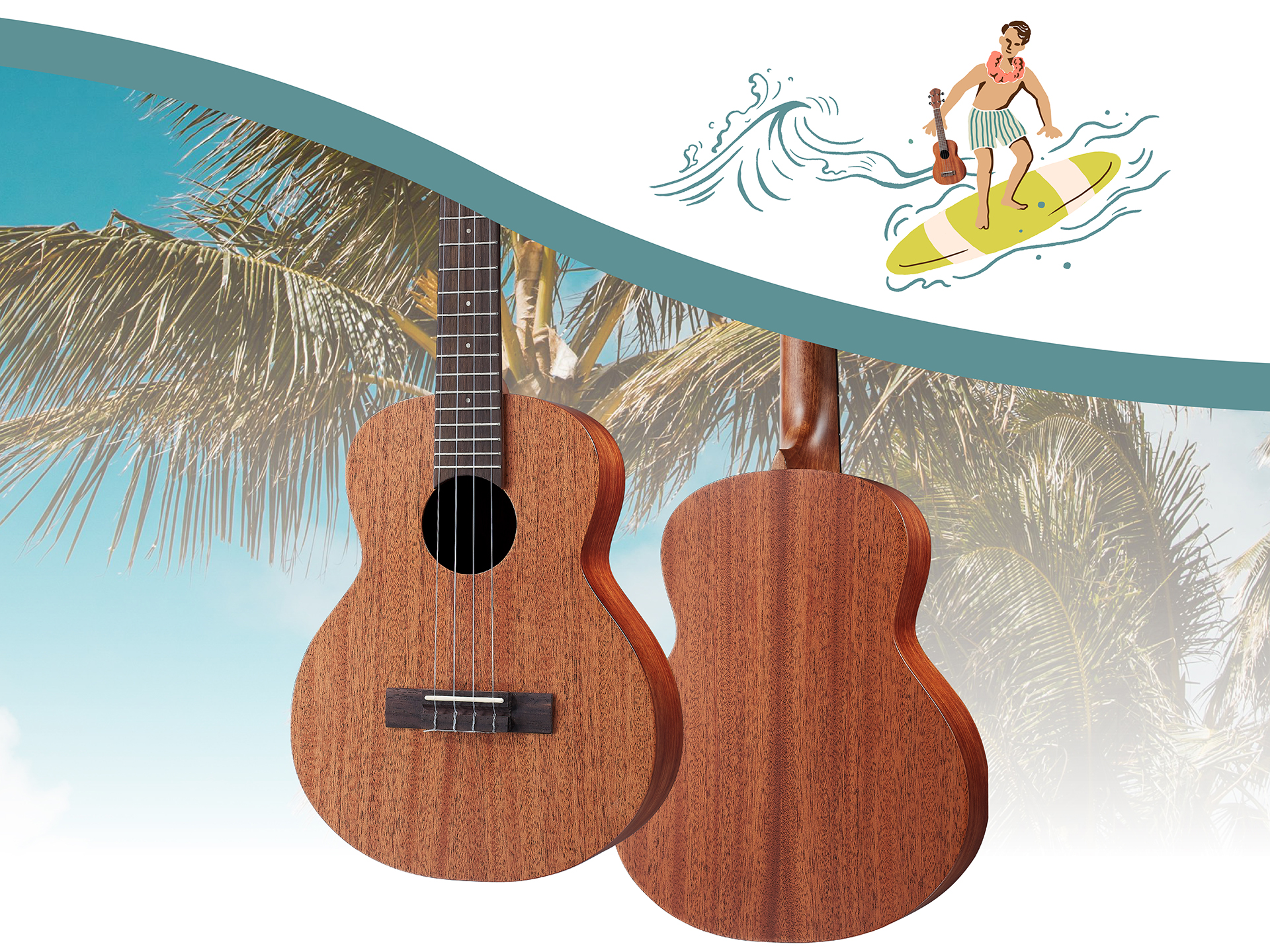 桃花心木,紋路較直,質地堅硬重量輕,聲音傳導較快,音色清脆高亮。彈奏時高頻較有顆粒感,低頻的呈現較溫暖豐富。 合板木材音色穩定,堅硬不易彎曲變形的特性,較不受氣候與濕度變化影響,能適應劣質的環境。中層使用白楊木,維持木頭之間良好的傳導之外,能有效減輕重量。
