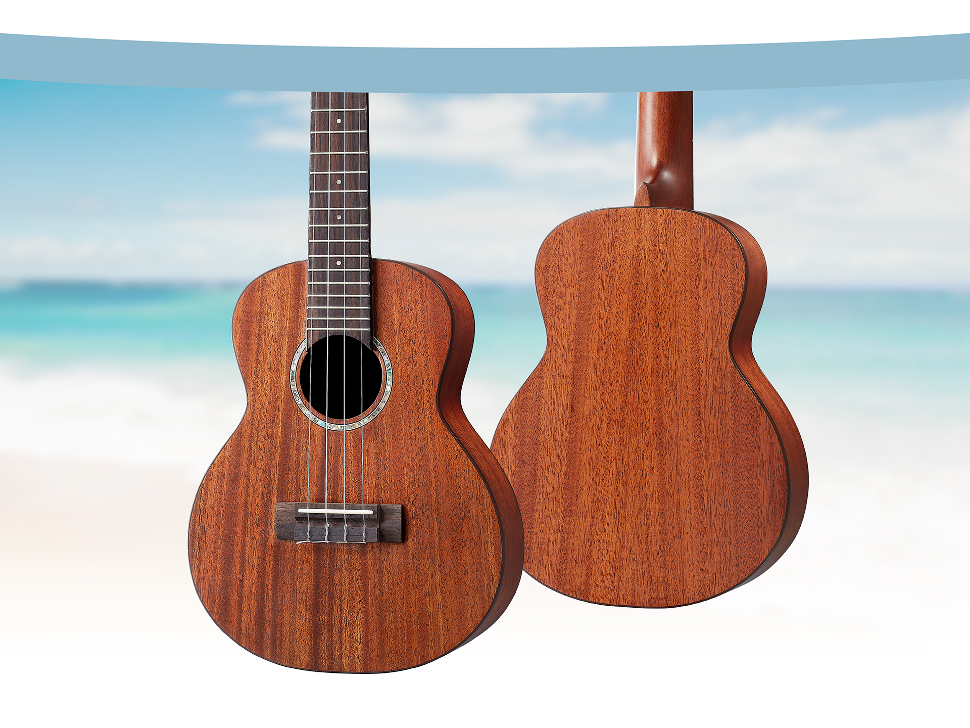 桃花心木,紋路較直,質地堅硬重量輕,聲音傳導較快,音色清脆高亮。彈奏時高頻較有顆粒感,低頻的呈現較溫暖豐富。 合板木材音色穩定,堅硬不易彎曲變形的特性,較不受氣候與濕度變化影響,能適應劣質的環境。中層使用白楊木,維持木頭之間良好的傳導之外,能有效減輕重量。